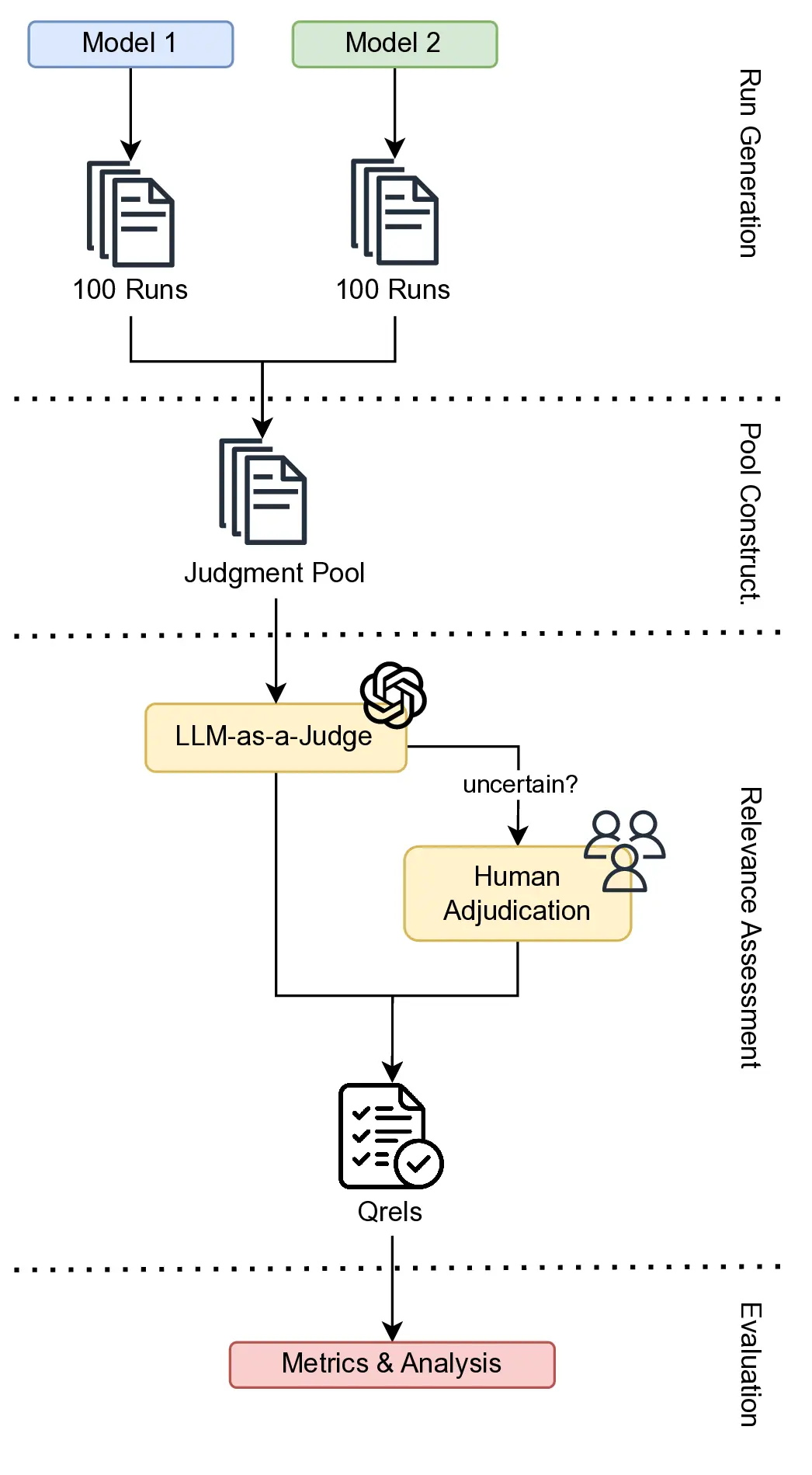 - LLM-as-a-Judge: GPT-4o mini initially screened the judgment pool, providing graded relevance scores and textual justifications.